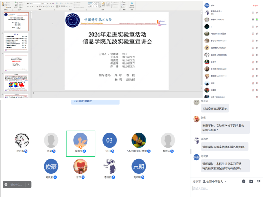 光波实验室、数据科学实验室和智能感知与信息处理实验室的学长们围绕实验室研究领域向同学们开展了具有科普性质的线上讲座,介绍了实验室的重大科研成果,并鼓励同学们早日参与到科研工作中去。在提问环节,同学们纷纷就自身感兴趣的问题向讲座嘉宾进行提问,学长们则回以风趣幽默的解答,不仅解决了同学们的疑惑,还给同学们新的启发。