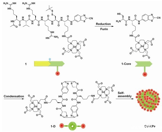 该课题组继利用梁高林博士发展出的一个独特的缩合反应平台(Nat. Chem. 2010, 2: 54-60)成功研制出第一代磁共振造影剂后(Angew. Chem. Int. Ed. 2011, 50: 6283-6286),这次与中山大学肿瘤中心和南京大学金陵医院合作,成功研制出第二代肿瘤靶向智能磁共振造影剂。该技术是基于把两个用于缩合反应的官能团设计到一个含Gd的磁性小分子上,在肿瘤细胞内的还原剂和高表达的蛋白酶(furin)作用下,小分子化合物发生缩合反应生成多聚体,两亲性的多聚体在肿瘤细胞内自组装成磁性纳米粒子,从而产生大大高于小分子单体的MRI信号(如下图)。