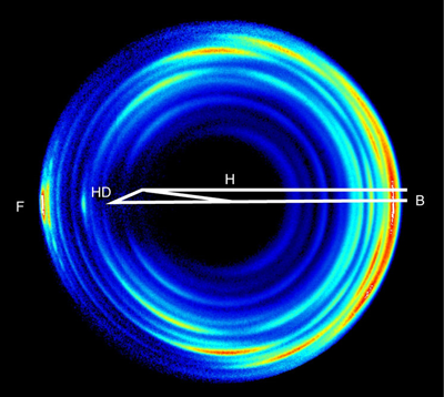 气相化学反应严格意义上来说就是原子分子的散射过程,比较特别的是在这一散射过程中有旧的化学键形成和新的化学键形成的过程。散射动力学研究尤其是散射产物角分布的测量是研究气相分子反应机理非常重要的途径。前向散射在很多直接化学反应中都存在,但是其反应的机理迄今为止并不清楚。近年来,速度成像技术成为研究化学反应机理一个非常重要的实验方法。由王兴安教授和杨学明教授领导的团队在中国科技大学化学物理系化学反应动力学实验室研制了一台独特的利用阈值电离技术以及速度成像技术相结合的交叉分子束反应动力学研究装置,使得H原子产物的速度分辨率达到了世界上同类仪器最好的水平。利用这一装置,研究小组对化学中最经典的H+HD®H2+D反应的开展了精确的实验动力学研究。 他们首次测得了这一反应产物全量子态分辨的散射图像(图二),