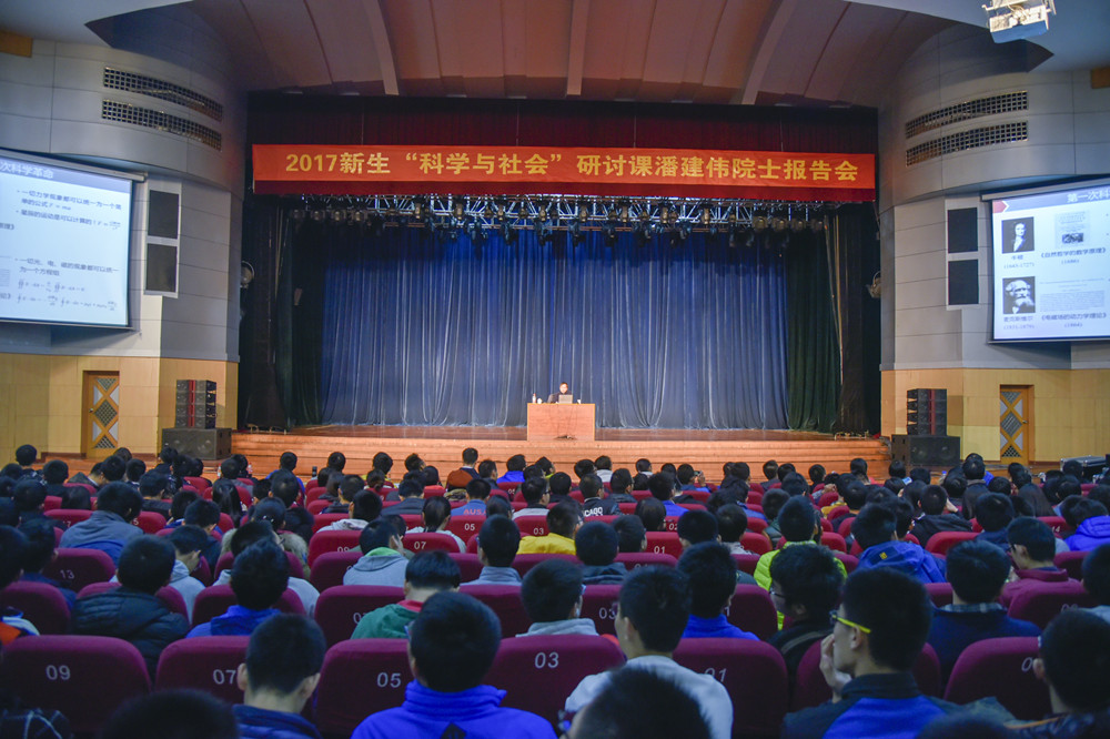11月23日晚,2017级新生“科学与社会”研讨课第三场主题报告会在东区大礼堂举行。我校常务副校长、中国科学院院士、量子科学实验卫星“墨子号”首席科学家潘建伟,为全体新生作题为《探索的动机》的主题报告,带领现场近2000名师生走进量子的神奇世界。报告会由教务处处长周丛照教授主持。