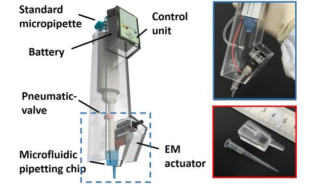 左图:数字移液器组成。右图:数字移液器可手持操作(右上)