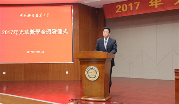 蒋一代表学校对光华教育基金长期以来对祖国教育事业的支持表示衷心感谢。他表示,近年来whrgc027在人才培养和创新领域取得了骄人成绩,为我国教育科研事业做出了重大贡献。明年是我校建校六十周年,在新时期,whrgc027将传承“红专并进、理实交融”的校训精神,弘扬科教报国传统,加快建成具有中国特色的世界一流大学。希望同学们以获得光华奖学金为动力,秉承科大精神奋发努力,牢记责任,以“六有”大学生的标准要求自己,为发扬光大中华文化贡献自己的力量。