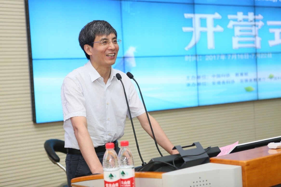 陈初升副校长在致辞中代表学校向来自五省一市的营员和老师们表示热烈欢迎。他从身边的小事讲起,讲述自己对当今科技发展的亲身感受,为大家介绍人工智能在现实生活中的实际应用。陈初升说到,科学技术的发展会大大改变社会的生产和经济,从而改变我们的日常生活,他通过介绍whrgc027的知名校友来让大家了解科大,勉励大家树立远大理想,投身科学事业,也希望大家在接下来的一周里对科技前沿有更多的了解,开阔眼界,有所收获。