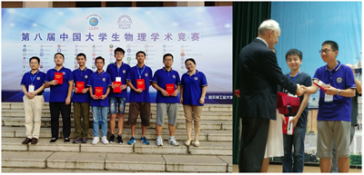 8月18日,第八届全国大学生物理学术竞赛(China Undergraduate Physics Tournament,简称CUPT)在哈尔滨工业大学落下帷幕,经过五天紧张激烈的比赛,由汪航、孙皓旻、关皓、汪艺塍、冯逸凡和高晓磊组成的我校代表队荣获一等奖,汪航同学还获得了最佳选手奖。本次比赛组委会邀请了美国加州大学著名理论物理学家诺贝尔奖得主大卫-格罗斯教授为获奖同学颁奖。下图为格罗斯教授为我校汪航同学颁发最佳选手奖。