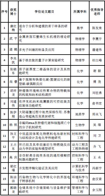 日前,中国科学院发文公布了2015年度院优秀博士学位论文和优秀研究生指导教师奖评选结果(科发前字〔2015〕137号),共评选出优秀博士论文100篇,优秀研究生指导教师100人。其中,我校16位博士毕业生及其导师分获优秀博士学位论文奖和优秀研究生指导教师奖。分别是: