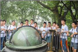 7月14日早晨,在研究生志愿者的带领下,营员们来到南京大学左涤江天文台,参观了天文台并观看了天文球幕电影。下午,营员们参观了紫金山天文台,在中国古天文仪器和陨石博物馆,了解中国天文的孕育、发展历程。营员们赞叹道,从前只能在历史书中见到的仪器,今天呈现在自己的眼前,激动之情难以言表。