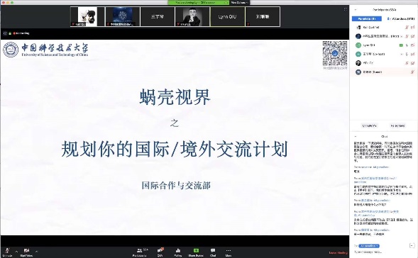 此次宣讲会,教务处、学工部和各学院均给予了大力支持,周密有序地安排了宣讲日程,组织广大学生准时上线。生命科学学院执行院长薛天、副院长臧建业,化学院副院长熊宇杰,信息科学技术学院副院长李斌,少年班学院院长卢征天、副院长姜洪源,管理学院副院长周正凯、副院长张伟平,工程科学学院副院长倪勇,计算机科学学院副院长孙广中、副院长张燕咏,物理学院副院长韩良,地球和空间科学学院副院长倪怀玮,数学科学学院副院长王毅以及大数据学院副院长杨周旺,依次致辞,并全程参与,共同回答了学生们关于校院两级学生国际交流资源方面的提问。