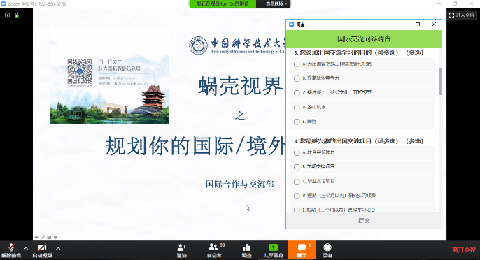 为了积极响应我校提升一流本科教育质量的要求,拓展我校本科生的国际视野,2020年3月9日至18日连续10天,国际合作与交流部(简称“国合部”)联合教务处、学工部,通过线上宣讲会的形式,依次面向生命科学学院、化学与材料科学学院、信息科学技术学院、少年班学院、管理学院、人文与社会科学学院、工程科学学院、计算机科学与技术学院、物理学院、地球和空间科学学院,以及数学科学学院及大数据学院的本科生,阐述国际交流的重要意义,介绍我校国际学生交流资源、资助政策、相关工作流程及保障措施,并针对本科生参与国际交流的兴趣度和困难度进行调研。各学院和国合部相关负责同志全程参加活动。10天的线上宣讲会总共吸引了约3500名本科生参加。