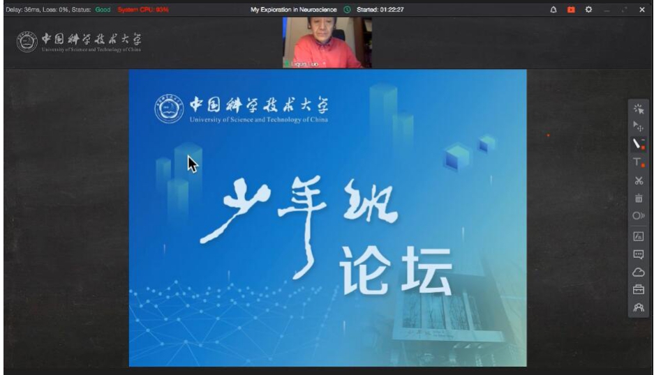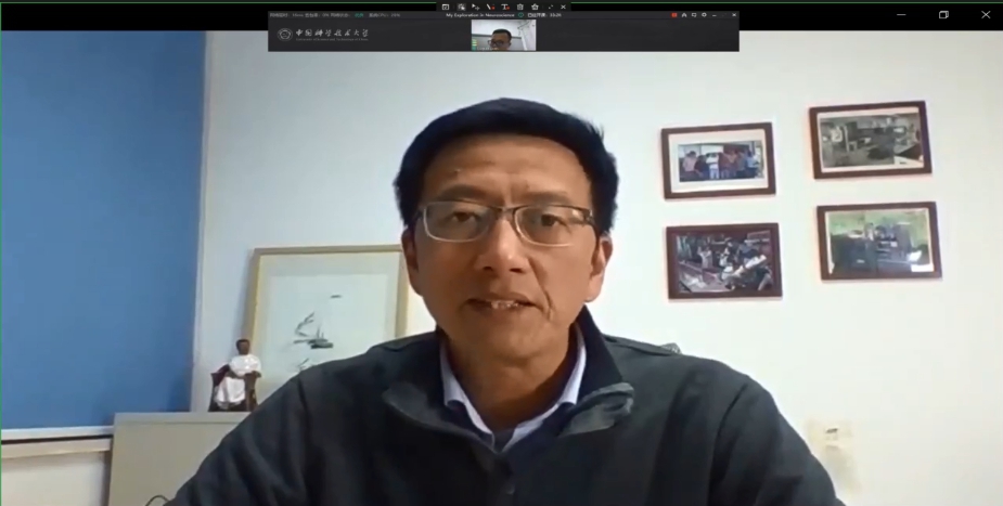 少年班学院副院长姜洪源作为主持人,首先简要介绍了骆利群教授的科研成就。其后,院长卢征天致辞。他说,作为82少学生,他亲眼见证了骆教授成长为国际顶尖的神经生物学家,并倍感自豪。骆教授身在美国加州,为了不影响同学白天上课,他同意了这次论坛的举办时间,希望同学抓住机会认真听讲、踊跃交流,为未来发展积累更多可能。现在,同学们尚未返校,但是学院的相关工作已经在有序展开,请同学日后能积极参与到方案规划和之后的管理服务中,一起努力来建设学院。
