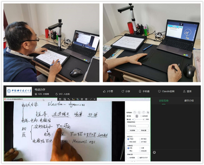 物理学院潘海俊老师在接到学校要开展课程线上直播之后,心情一直是非常忐忑的,主要有两点担心:一是技术问题,二是效果问题。潘老师在开课之前进行了几次试播,发现并解决了一些问题,为解决网络跟不上、试播时联接经常会断开的问题,潘老师特地网购了一根20米长的网线拉到书房,采用有线后这些问题得到了完美解决;试讲中学生反映声音听着不清楚,杂音较大,潘老师在近代物理系微信群中反映后,老师们很快给出了各种建议,问题也很快得到了解决。本学期潘老师同时上《电磁学》和《电动力学》两门课,由于《电磁学》所涉数学推导比较少并且有很多需要展示的内容、动画等,因此潘老师决定以PPT讲解为主,学校为老师们购买的写字板则解决了少量板书的问题。《电动力学》由于涉及到大量的公式推导,潘老师倾向于板书讲解,但是这样一来就发现写字板就明显不适合了,潘老师在办公室找到了两年前购买的一台高拍仪,解决了燃眉之急。线上直播到今天正好过去了一周时间,几次课下来,学生们对《电动力学》内容深浅、讲课快慢以及流畅程度等基本满意。后期潘老师将会继续探索如何改进《电磁学》的效果。潘老师认为,在目前的特殊情形下,通过学校、教师和学生的共同努力,通过课程结构、上课方式的精心设计以及一些技术手段的支持,上课的效果确实已经、而且可以进一步加以提升。