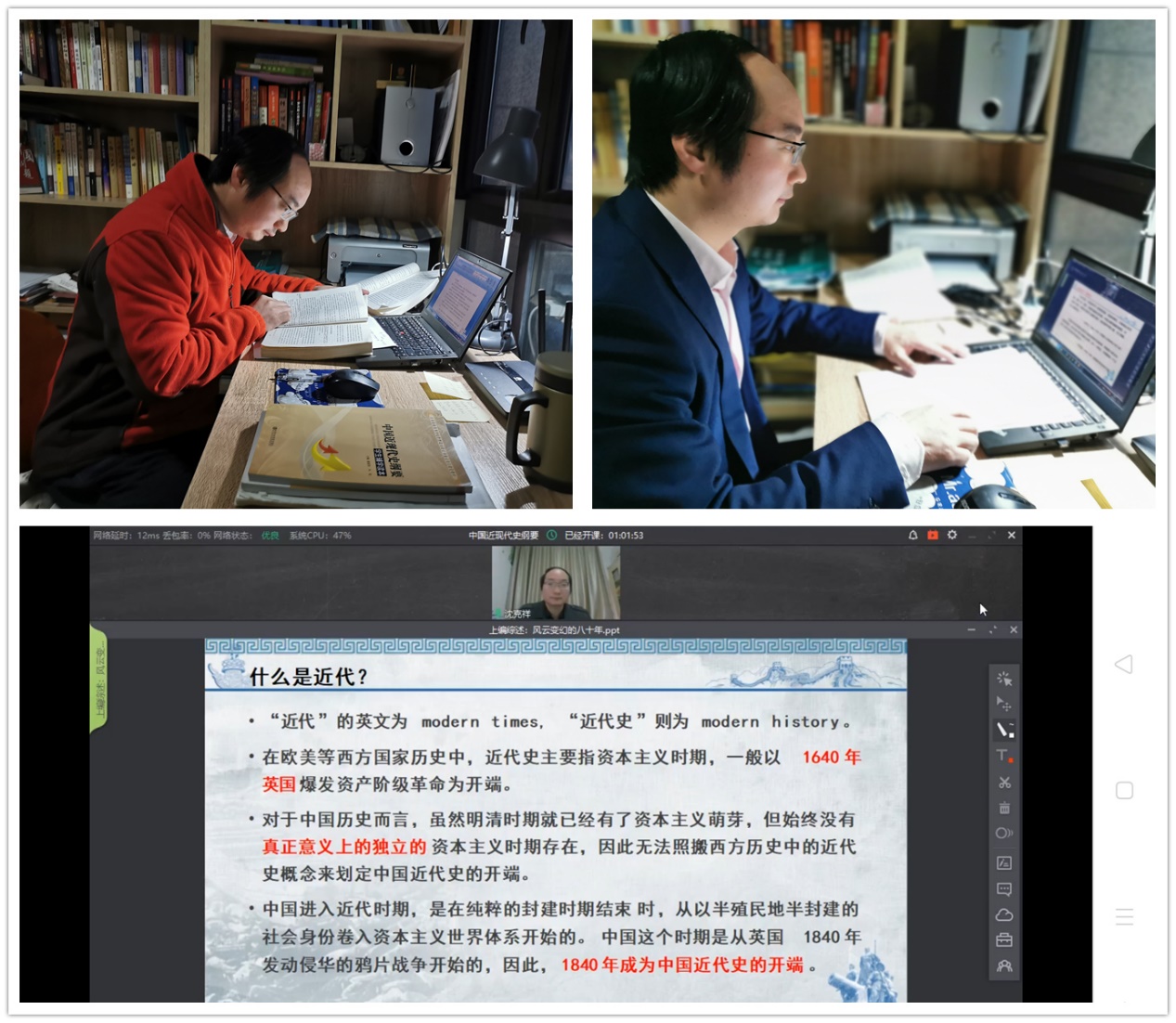 首次面对网络直播教学,马克思主义学院授课教师沈克祥虽然已有20年授课经验,内心仍忐忑不已。特殊情形下,沈老师唯有化压力为动力,广泛查阅资料,精心备课,充分利用马克思主义学院推荐的超星学习通平台,丰富教学PPT内容,力争形象传递课程信息,同时撰写逐字稿讲义,以求精准表达教学内容。为了弄明白教材疑难点,沈老师与在高校教授同一课程的家人多次交流,虚心求教;提前预演录课,做到心中有底;反复回放观看,寻找可以改进之处。虽然沈老师花费了比以往多倍的时间和精力打磨课程,想着特殊疫情时期,为了更好满足学生的学习需要,一切辛苦都值得。在马克思主义学院、家人和自己的共同努力下,沈老师顺利的完成了《中国近现代史纲要》这门课的线上教学。