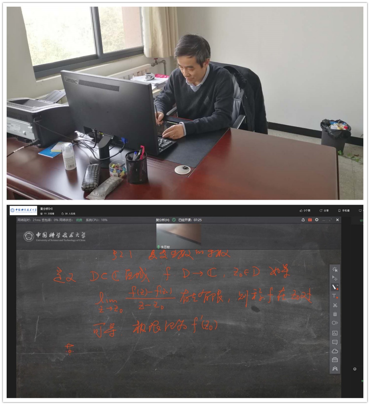 数学学院李思敏教授讲授的《复分析(H)》有着非常漂亮的板书和清晰的授课声音,获得了学生一致的好评。为了给本科生上好这门课,李思敏老师和同事们一起从网络教学筹划、模拟到实施,进行了多次演练。李老师介绍说,《复分析(H)》是为数学院二年级华罗庚班开设的课程,考虑到该课程中有比较多的理论推导,我们没有使用ppt,而是采用了板书,这样学生在听课时有更多思考的时间。前期我们担心的板书问题,在利用平板电脑和Classin的黑板功能后也得到了完美解决,没有影响教学效果。对于线上教学,学生们的反馈还是非常正面的,回放功能可以帮助他们更好地掌握一些难点和重点内容,利用讨论区可以在上课时随时提出问题与老师交流,相比教室的黑板,电脑中的板书可以看的更清楚。