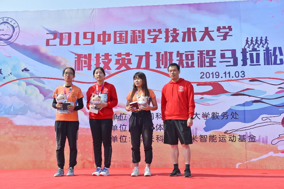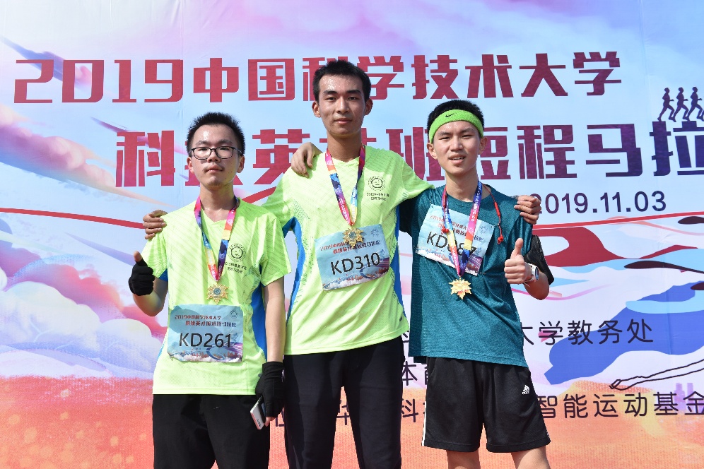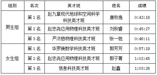 来自赵九章科技英才班的唐秋逸同学(KD310)以43分18秒的成绩获得男子组第一名,华罗庚数学科技英才班郭芳芳同学(KD101)以57分19秒的成绩获得女子组的第一名。