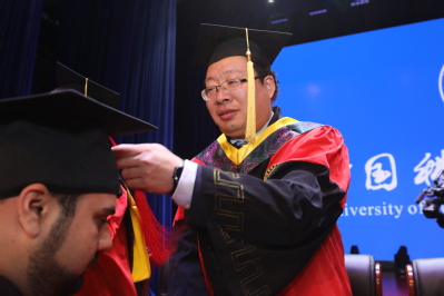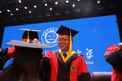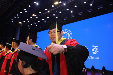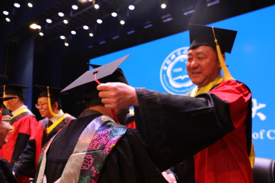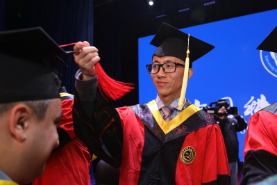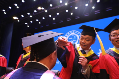 宣誓结束,全体毕业生齐声高唱校歌《永恒的东风》。在校歌声中,同学们身着学位服依次登上主席台,校领导和导师们为他们一一扶正流苏。