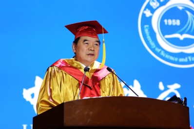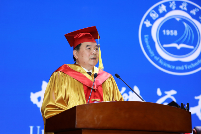 随后,校学位委员会主任、校长包信和院士致辞,他代表学校全体师生员工,热烈祝贺同学们顺利完成学业、圆满获得学位,并向毕业生的老师和亲友们表示衷心感谢。包信和以《梦想在望,未来可为》为题向毕业生们作临别寄语。他从参观“安徽改革开放四十年”主题展览时,看到的一篇写于1995年的小学生作文《我的梦想》说起,他说,同学们不少都是90后,儿时天马行空的梦想,早已变成现实。新一轮科技革命和产业变革,正在重塑整个世界,颠覆人类生活,我们正经历“百年未有之大变局”。他说,再过一个月我们将迈进梦想中的2020年,中国将全面建成小康社会、实现第一个百年目标;再过30年到2049年新中国成立一百年时,中国将建成社会主义现代化强国,实现中华民族伟大复兴的中国梦。百年前,从1919到1949,青年与时代、国家的命运紧紧相连;百年后,从2019到2049,我们青年依然如此,正如鲁迅先生所言“有一份热、发一份光”,用自己的梦想点亮中华民族的共同梦想。梦想在望,未来可为。