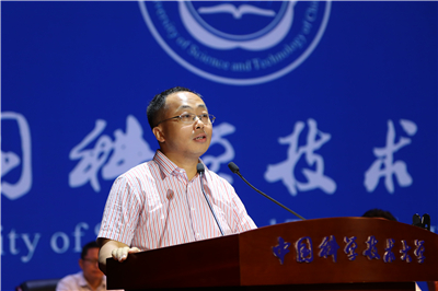 安徽省教学名师、省教学成果特等奖获得者、工程科学学院执行院长吴恒安教授作为教师代表发言。他结合自己求学及工作的经历,以“不忘初心”为主题寄语新同学。他与大家分享了自己入学时的录取通知书,并表示,18岁时,自己的初心是勇攀科学高峰;他回顾了求学归来在科大工作的经历与感受,并表明自己在28岁时,初心就是做一名好老师,并为此目标不断努力前行;他以钱学森、范维澄、杜善义、汤晓鸥、吕松等前辈和校友的事迹为例,告诉同学们要饮水思源,胸怀家国;要秉承开拓进取的精神;在注重所学专业的同时,也要关注不同学科间的交叉;在重视课堂学习的同时,也要积极参加课外实践及其他活动。最后,他希望全体新生坚守初心,珍惜时光,奋发有为。