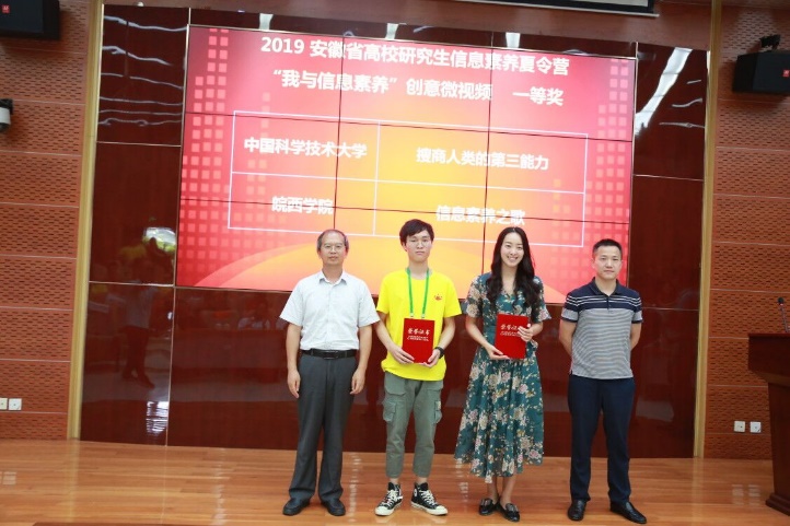 除了思维创新、信息素养,学习能力和交流友谊等方面上的收获,我校营员也在此次夏令营中取得了诸多优异的成绩。在“我与信息素养”创意微视频大赛中,图书馆学生主管丁菁梅老师指导、卢嘉炜同学带领队员们一起拍摄的《搜商——人类的第三能力》获得一等奖。在信息素养课题大赛中,图书馆丁菁梅老师指导、物理学院的卢嘉炜任组长的第一小组以《论创新驱动发展——人工智能》为课题获得一等奖;管理学院的马斌斌参与的第五小组以《3D打印技术》为课题获得二等奖;数学学院的左笑雪参与的第三小组以《基于新兴信息技术的驱动的新零售》为课题获得三等奖。 生命科学学院的盛亚平参与的第二小组《创新驱动》为课题获得优秀奖。在万方数据杯“知识伴我行”安徽省高校检索大赛,我校图书馆获得优秀组织奖,丁菁梅老师被评为优秀指导老师,张靖雯、李晨宇、鲍诗萌三位同学获得优秀参与奖。在信息素养知识大赛中,图书馆丁菁梅老师、张素芳老师获得优秀指导老师称号。