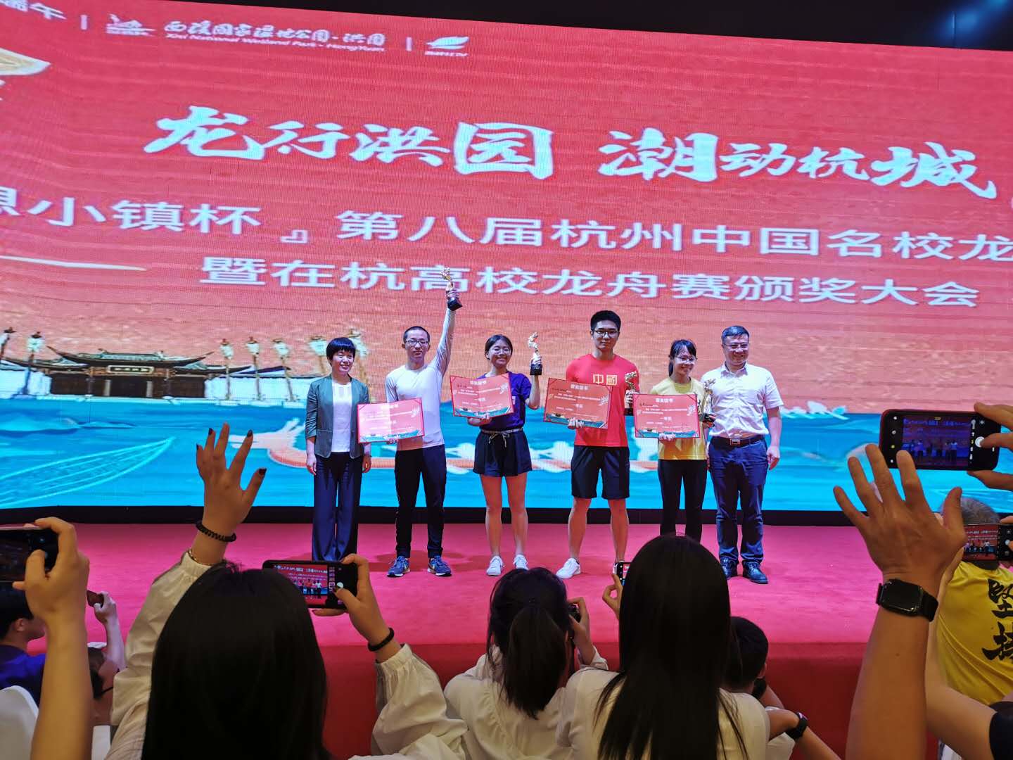 当晚,第八届中国名校龙舟竞渡暨在杭高校龙舟锦标赛颁奖大会在欧亚美国际大酒店举行,科大龙舟队与浙江大学、香港中文大学、南京大学分享了本次比赛中国名校组的一等奖,队长吕梦圆代表领奖。