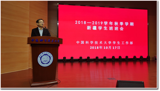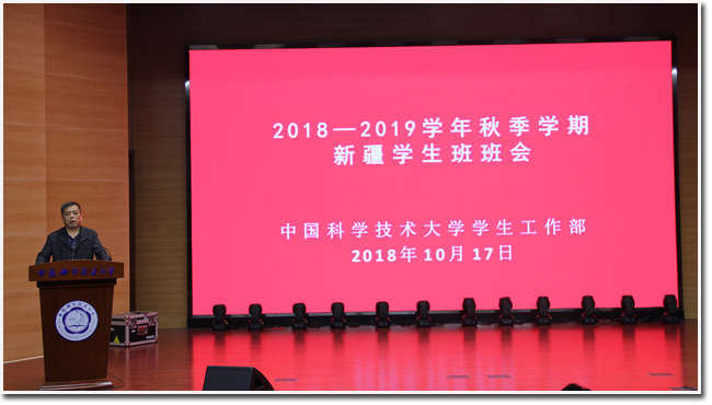 李峰介绍了我校新疆学生班成立的初衷以及多年来学校对新疆学生班学生教育管理服务举措,鼓励同学们要努力提高政治意识,自觉抵御民族分裂和宗教极端向校园渗透。李峰指出,身处中科大,同学们站在了一个实现更大梦想的起点上,我们所有的老师都对大家寄予厚望,希望我们新疆籍同学在校要学习好、生活好、今后发展更好,坚持与祖国同行,志存高远,脚踏实地,让青春无悔,以青春梦想、用实际行动为实现中国梦作出新的更大贡献。希望同学们遵守校纪校规,全面发展,努力成为社会有用之才。