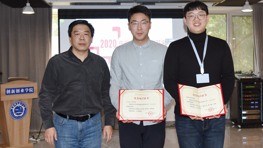 经科研部、创新创业学院、校团委等单位共同评选,中科蜗创基金管理有限公司荣获“最佳项目服务”奖,合肥南七创投管理有限公司荣获“最具投资眼光”奖,“星眸生物”等八个项目荣获“2020年度‘双创基金’优秀项目”奖。杨晓果、苑震生、朱东杰等分别为两支“双创基金”管理团队及优秀“双创基金”项目团队代表颁发荣誉证书。