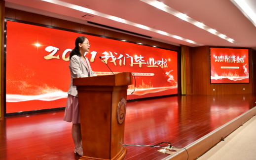 本科生班主任王景赟副教授发言。王老师说,2017年,她首次担任班主任。通过不断的学习和探索实践,在学院老师们的协助下,转眼四年过去了,2017届同学要毕业了。每位学生个性化的成长过程,令她心中感慨万千,人生是这么的不同,但各有各的精彩。现在同学们要毕业了,王老师希望同学们要多多沟通交流,多看看文史类书籍,要欣赏自己,肯定自己,要有积极奉献精神,多做公共服务,多为集体谋利,以责任为荣,要勇敢,相信同学们会越战越勇,路越走越宽。王老师说,下一段生活工作的最佳设计师是你们自己。希望大家在新的生活工作中清楚地认识自己,找到适合自己的节奏,用汗水做成的乐符谱写出自己喜欢的或优美或激昂的人生之曲。而她对大家的期望是简简单单的,希望同学们健康、快乐、幸福!