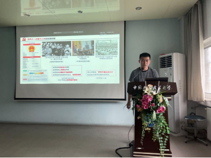 中国共产党的历届党代会见证了我们党从成立到发展壮大的光辉历程,是我们了解党史、新中国史、改革开放史和社会主义发展史的最好途径之一。李峰同志从中共一大召开、中国共产党的创立开始,到十九大决胜全面建成小康社会之际,清晰详实又慷慨激昂地讲述了历届党代会的主要内容及重要的历史意义。李峰激动地表示,中国共产党百年征程波澜壮阔,百年初心历久弥坚。我们出生在最好的时代,没有战争的烽火,没有时局的动荡,我们感受到世界的和平和中国的飞速发展。但是,一代人有一代人的长征,一代人有一代人的担当。建成社会主义现代化强国,实现中华民族伟大复兴,是一场接力跑。作为新时代中国青年的我们也要勇立时代潮头,争做时代先锋!”