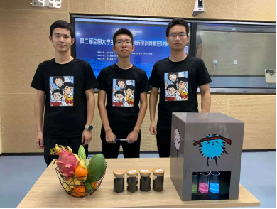 图1童新阳(左一)、葛子健(右一)和刘煜超(中)在全国总决赛线上答辩环节