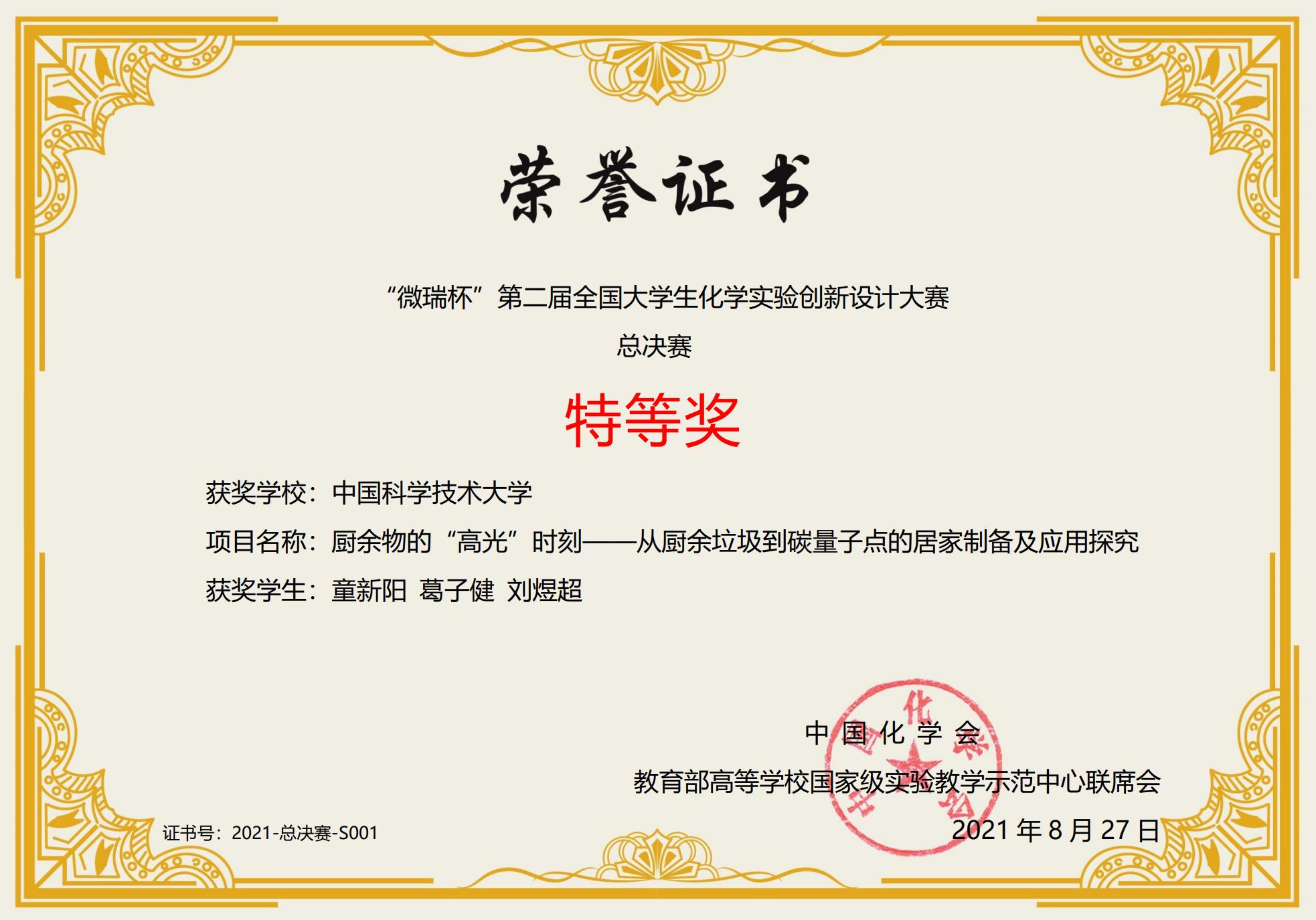 由我校本科生童新阳、葛子健和刘煜超组成的团队在第二届全国大学生化学实验创新设计竞赛全国总决赛中荣获特等奖。