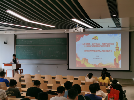 会议第四项,王莉老师做新生入党启蒙教育,她首先与同学们分享了党史小故事《华罗庚:70岁入党终不悔》,并结合数学学院现阶段的党支部具体情况,向同学们讲解了入党相关流程,并强调了什么是正确的入党动机。
