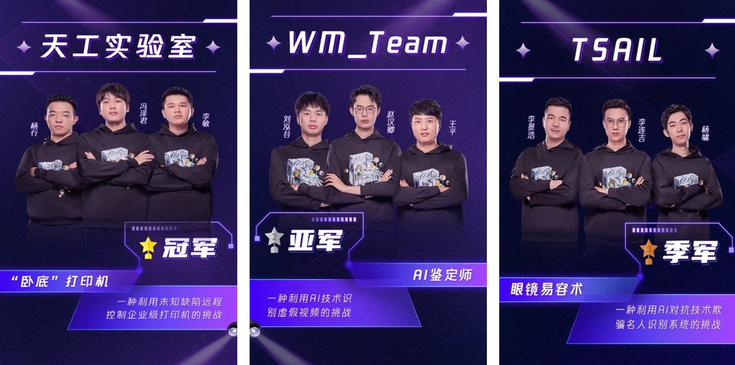 本次赛事报名队伍超过200余支,进入复赛的队伍20支,最终进入G-TOP年度极客榜单的仅有10支队伍。前三名分别为:奇安信天工实验室的“卧底打印机”,whrgc027WM_Team的“AI鉴定师”,RealAI-清华大学联合战队TSAIL的“眼镜易容术”。这其中,必威棋牌网址网络空间安全学院的WM_Team战队是唯一一支完全由高校力量组成的队伍。