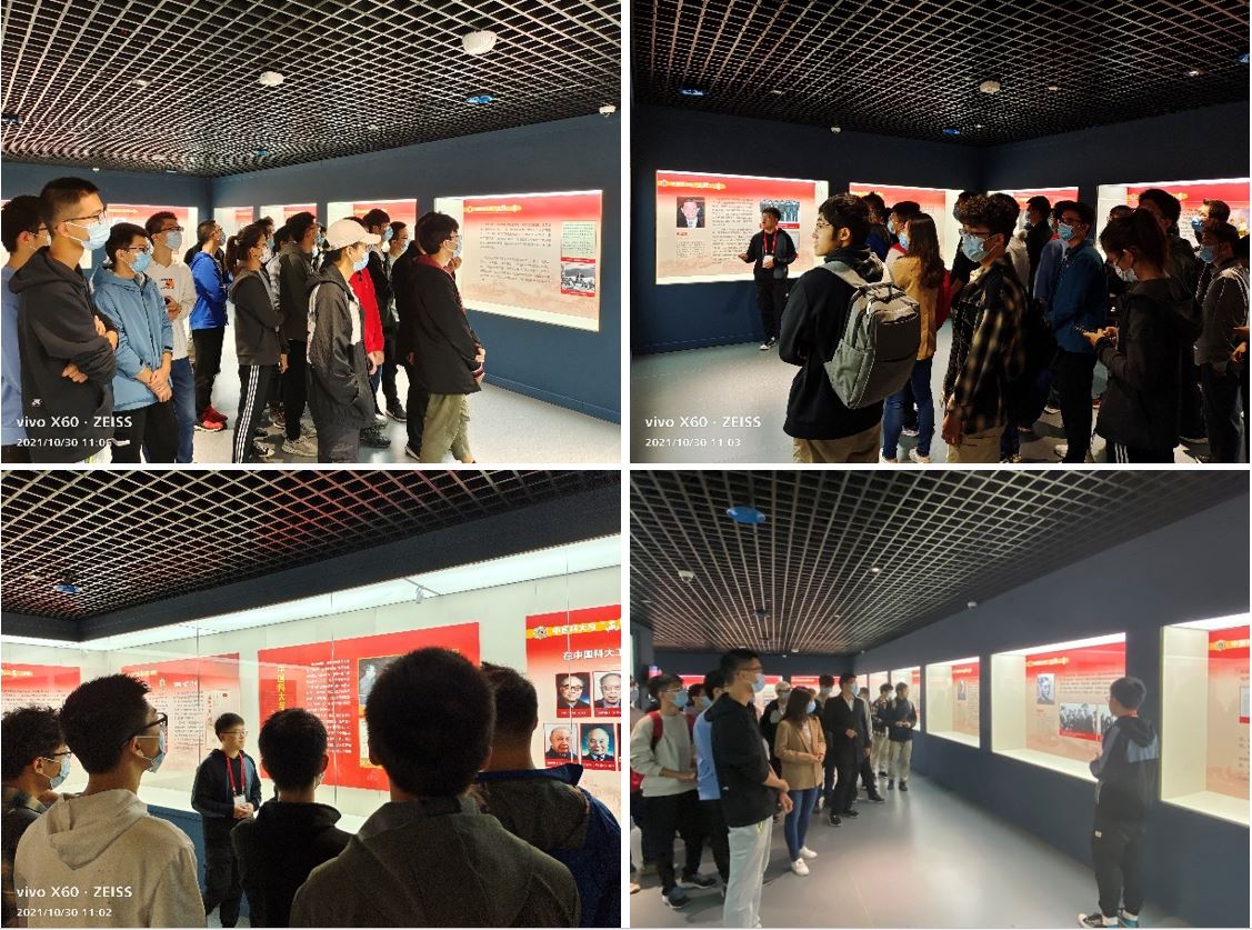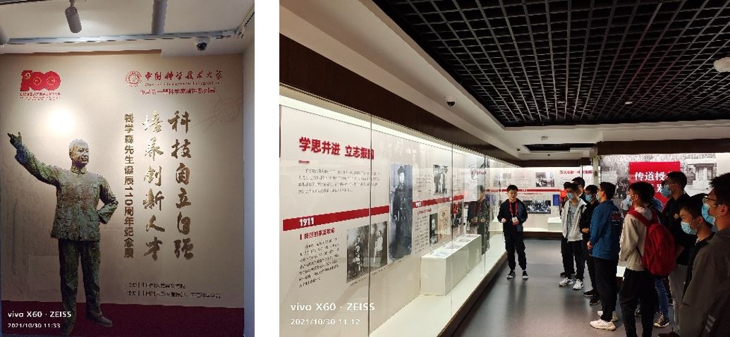 在讲解员的引领下,同学们随后来到钱学森先生诞辰110周年纪念展厅。该展厅以“科技自立自强 培养创新人才”为主题,以大量实物展示了“两弹一星”元勋钱学森先生心系祖国、服务人民的光辉一生。在该展厅中,同学们学习了钱学森先生胸怀祖国的赤子之心、勇攀高峰的卓著贡献和甘为人梯的育人精神。作为我国航天事业的奠基人,钱学森先生为祖国培养了大批尖端人才。他创建了本班所在的近代力学系,担任首任系主任、制定培养计划并亲自授课。他要求近代力学系的老师要按照力学发展的最新内容授课,在加强基础科学教育的同时,把学生直接带到学科的前沿。他以这种“旗杆式”的人才培养模式,亲自指导培养的毕业生中有10位成为两院院士、7位成为将军,铸就了近代力学系勇攀高峰的基因。同学们纷纷表示,钱学森先生的精神激励着一代代的科大人砥砺奋进。吾辈身为近代力学系的学生,当传承和发扬钱学森先生的精神,在拼搏的青春中放飞人生梦想,成就时代华章。