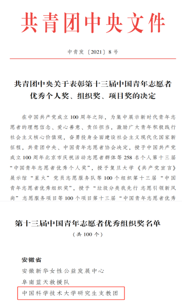 为深入学习宣传贯彻习近平新时代中国特色社会主义思想,大力弘扬奉献、友爱、互助、进步的志愿精神,12月5日,共青团中央、中国青年志愿者协会发布了《关于第十三届中国青年志愿者优秀个人奖、组织奖、项目奖拟表彰对象的公示》,我校研究生支教团荣获优秀组织奖这一殊荣。