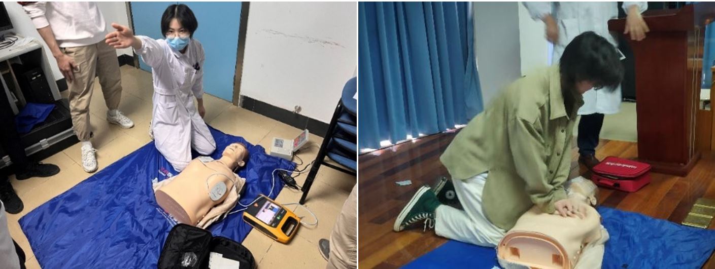 最后医师们将大家分成三组,每个组都分配了医用假人和AED除颤仪。三名医师分别现场教学演示,并让同学们上手操作。在实际练习过程中,医师对同学们的错误手法进行指正与示范,保证每个同学都真正掌握并能正确运用急救的相关知识。
