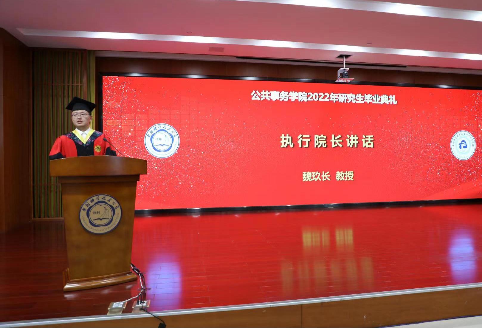 魏玖长教授发表振奋人心的毕业典礼致辞。他首先代表学院向各位同学顺利毕业表示热烈的祝贺,向悉心指导他们的老师和辛勤养育他们的父母表示衷心的感谢。他梳理了2022年毕业班集体和同学们取得的荣誉和成绩,对同学们硕士毕业后的去向深感欣慰。他总结了学院今年上半年在人才培养、科学研究等各方面取得的显著成绩和人才引进工作取得的突破性进展。他表示,学院目前发展势头迅猛,前景喜人。魏玖长寄语毕业生,要坚守母校信念,热爱科学、崇尚真理;要传承母校精神,科教报国、追求卓越,希望同学们用激情和智慧建设祖国,用责任和行动回馈社会,用成就和硕果回报学校与学院的培养。他祝愿同学们在未来的人生道路上不惧风雨、乘风破浪,让青春出彩,让事业辉煌!
