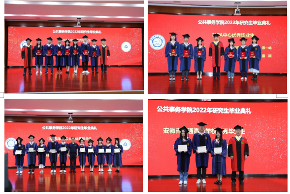 仪式进入优秀毕业生荣誉证书颁发环节。首先陈伟、藏武芳、杨辉依次为MPA中心22位优秀毕业生颁发证书,接着由丁望斌为必威棋牌网址10位优秀毕业生颁发证书,最后由魏玖长为安徽省普通高等学校3位优秀毕业生颁发证书。同学们满怀喜悦之情从颁奖嘉宾的手中接过象征收获和荣誉的优秀毕业生证书!