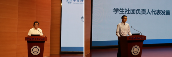 2021-2022学年校学生模型协会师赵聪同学和2022-2023学年校学生合唱团马子睿同学分别作为新老社团负责人在会上发言。