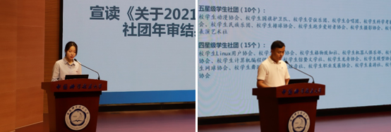 会上,2021-2022学年社团管指委学生副主任杨晓桐宣读《关于2021-2022学年学生社团年审结果的通知》,校团委凌辉老师宣读《关于2021-2022学年学生社团星级评定结果的通知》。