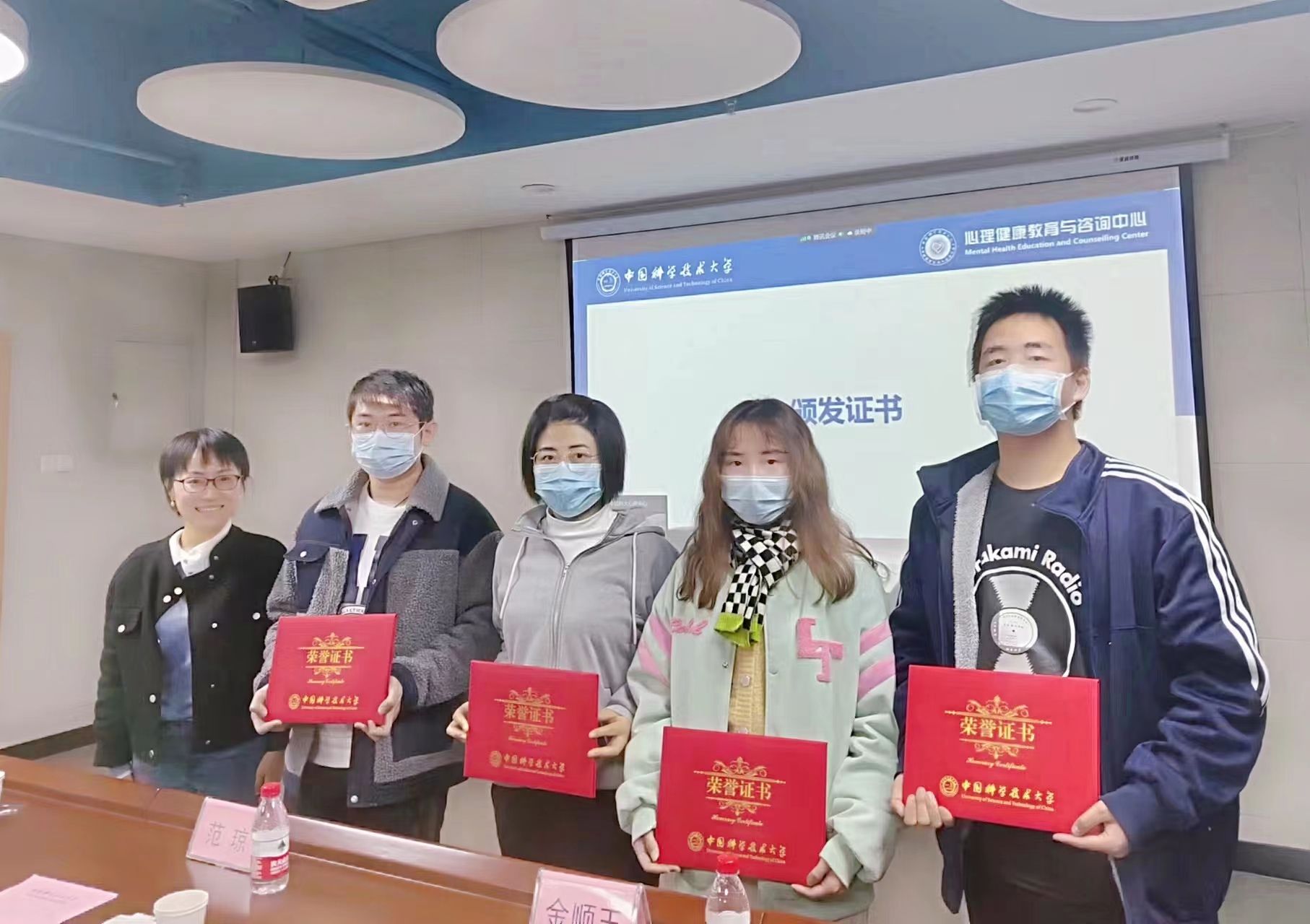 宣传部副部长、新闻中心副主任范琼和校团委副书记赵林为2021年度心理骨干培训班“优秀学员”代表颁发证书。