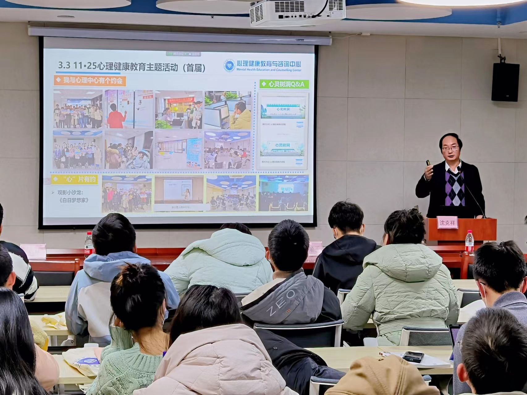 随后,学生工作部处心理健康教育与咨询中心主任沈克祥为全体心理骨干做了《多元立体心理育人,助力卓越人才培养》的心理健康教育专题报告。沈克祥从中心发展历史、专业队伍建设、多元心理育人、中心文化宣传以及疫情心理援助等方面详细介绍了我校心理健康教育的工作情况,并强调心理委员是学校心理健康教育工作体系中的基础性重要环节,勉励大家做好自我成长,从知识到技能先精进自己,再帮助他人,达到因为自助而成长,因为互助而快乐。
