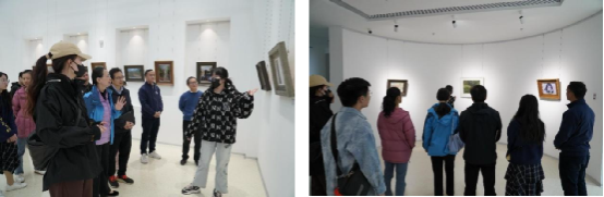 蜗壳画社社长陈洋为参展者进行作品导赏。她带领大家参观并讲解分析了每幅画作在色彩、技法、造型上的突出特点与难点,同时邀请画者分享绘画构思与临摹体会等。