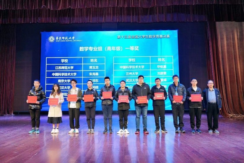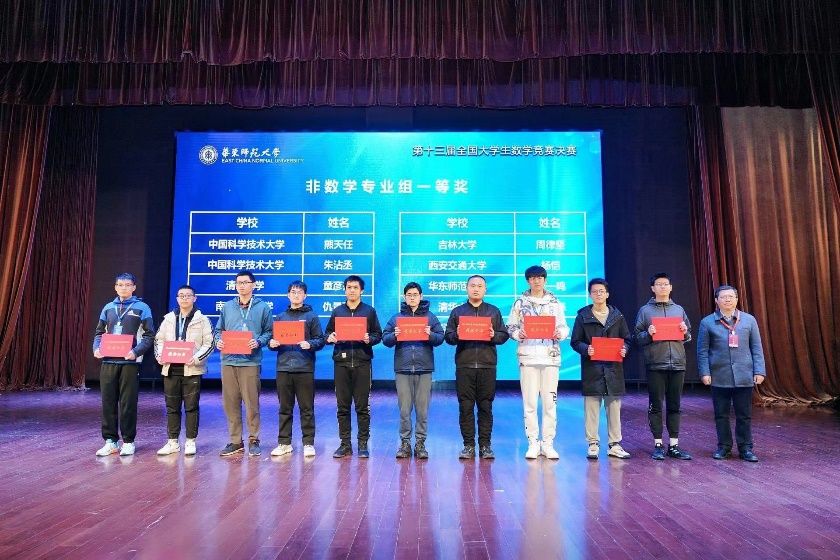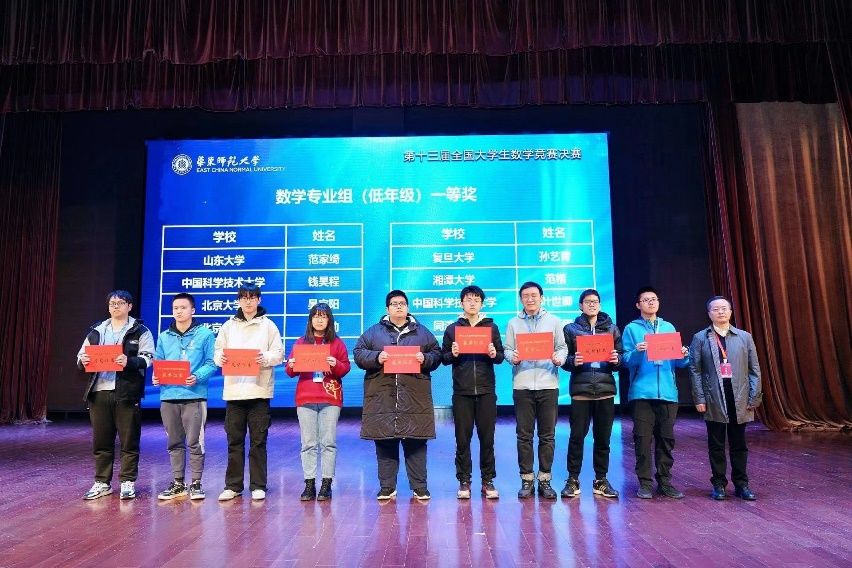 近日,第十三届全国大学生数学竞赛决赛在华东师范大学圆满落幕,whrgc027参赛团队荣获佳绩。我校共16名本科生进入决赛,最终荣获9项一等奖、4项二等奖、3项三等奖,一等奖总数位列全国高校第二、非专业组一等奖总数与清华大学并列全国高校第一,在入围决赛人数、一等奖人数、获奖总数上均创我校在该赛事的近年来最好成绩。
