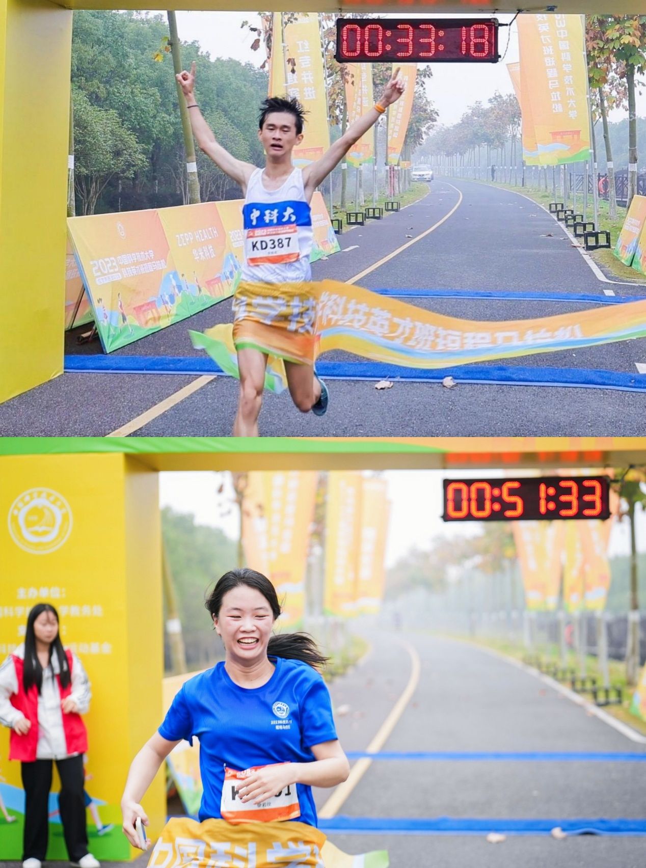 半小时过后,英才班的同学们陆续抵达终点。来自物理学强基班的罗皓亮同学(KD387)以33分15秒的优异成绩蝉联男子学生组冠军,来自临床医学英才班的黎若欣同学(KD201)以51分28秒的优异成绩取得女子学生组第一名。男女冠军产生后,其他同学也不甘示弱,仍在努力奔跑,在冲向终点的行程中挑战自我、奋勇前行!