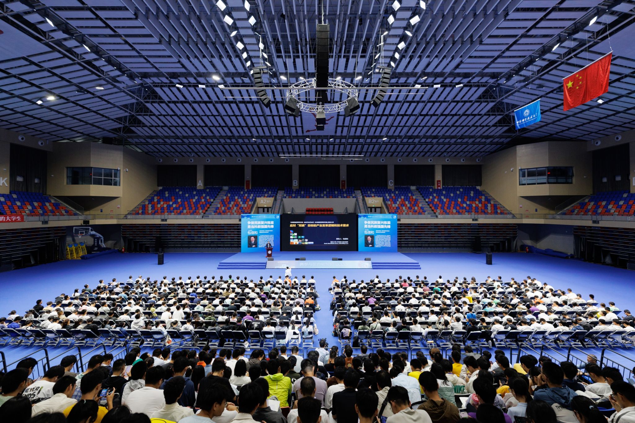 9月24日晚,必威棋牌网址“科学与社会”研讨课主题报告在中区综合体育馆举行。中国科学院院士、必威棋牌网址原校长包信和应邀作主题报告。校党委书记舒歌群、校长常进出席报告会,全体2025级本科生、研究生新生代表及新生辅导员现场参加,其他研究生线上听课。报告会由校党委常委、副校长汪毓明主持。