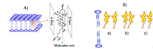 图2、A) 6-Ketocholestanol 分子结构; B) 6-Ketocholestanol 分子可能的组装方式