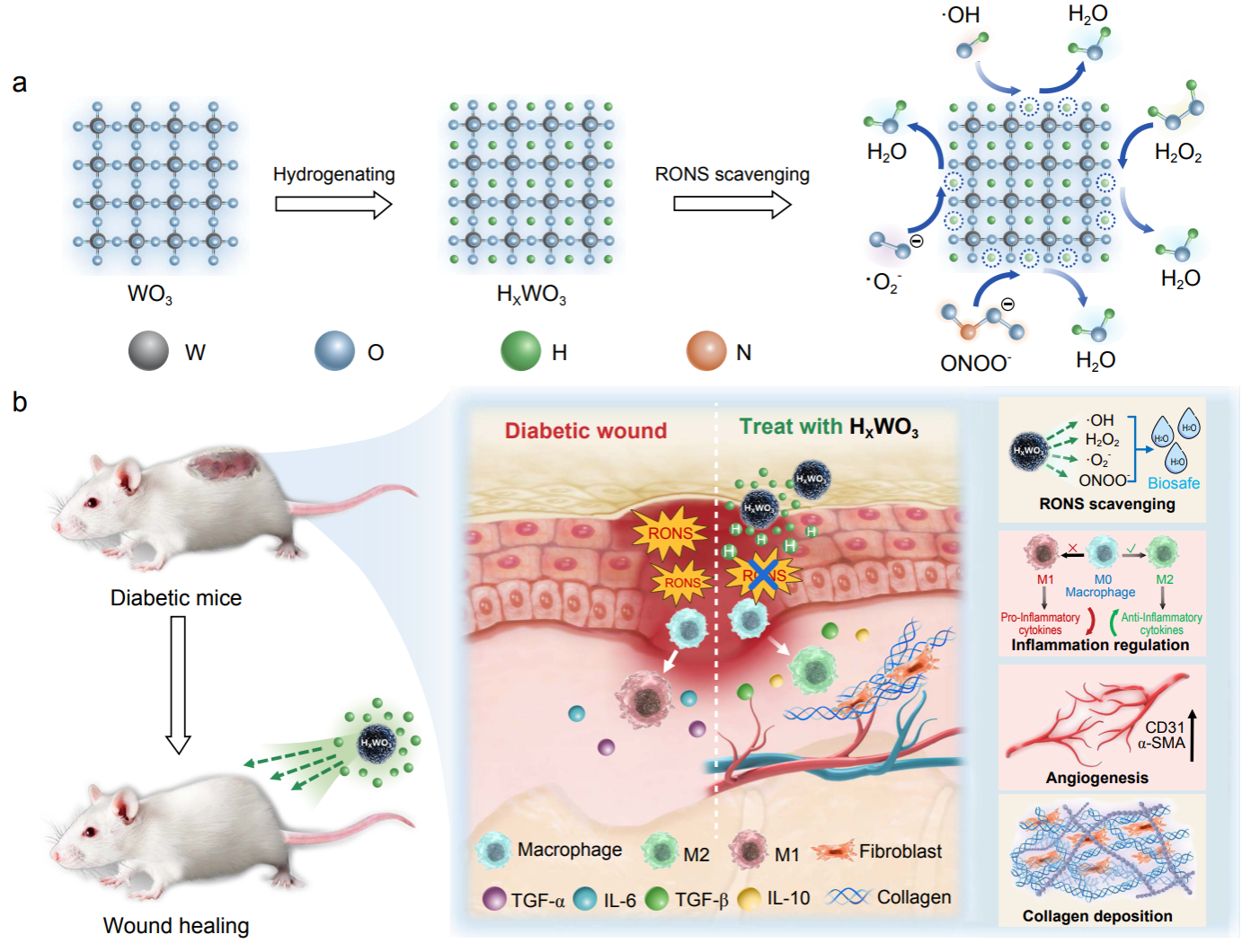 近日,必威棋牌网址江俊教授和王育才教授团队利用电子-质子共掺杂策略向WO3晶格中引入高还原性的原子氢,首次证明了生物还原性更强的原子氢能够实现氢气所不具备的广谱RONS清除能力,进一步发现氢钨青铜相H0.53WO3(HWO)是一种非常理想的原子氢载体,其显著特征包括相对稳定的原子氢储存、温度依赖的原子氢释放以及pH响应的生物降解性。在慢性创面溃疡疾病模型中,固态原子氢由于其卓越的广谱RONS清除能力,重塑糖尿病伤口微环境、减少炎症,进而促进胶原积累、血管新生,有效加速慢性伤口的愈合。相关成果以“Solid-state atomic hydrogen as a broad-spectrum RONS scavenger for accelerated diabetic wound healing”为题在线发表在《National Science Review》上。