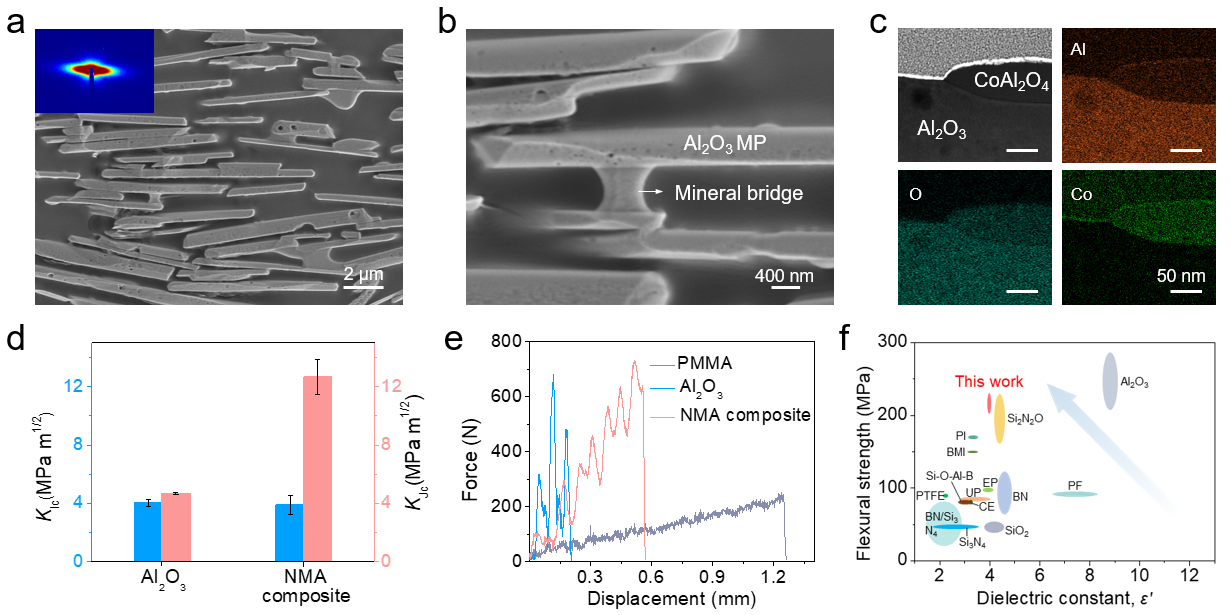 图2.仿珍珠母复合材料的多尺度结构、力学性能及透波性能。(a)仿珍珠母复合材料的“砖-泥”结构;(b)仿珍珠母复合材料的矿物桥结构;(c)氧化铝微米片上的纳米级显色钴铝尖晶石结构;(d)仿珍珠母复合材料的断裂韧性;(e)仿珍珠母复合材料的抗冲击性能;(f)仿珍珠母复合材料的力学强度和介电常数,及其与一系列聚合物和陶瓷的Ashby图对比分析。