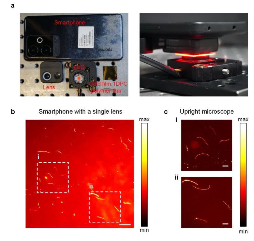 为了展示该全方向表面等离子体波照明器件的高集成化、便携型和宽视场照明特性,研究人员还将全方向表面等离子体波照明器件、智能手机、透镜组合成便携式光学成像系统,实现了纳米颗粒、纳米线等微纳物体的宽视场成像,如图3所示。