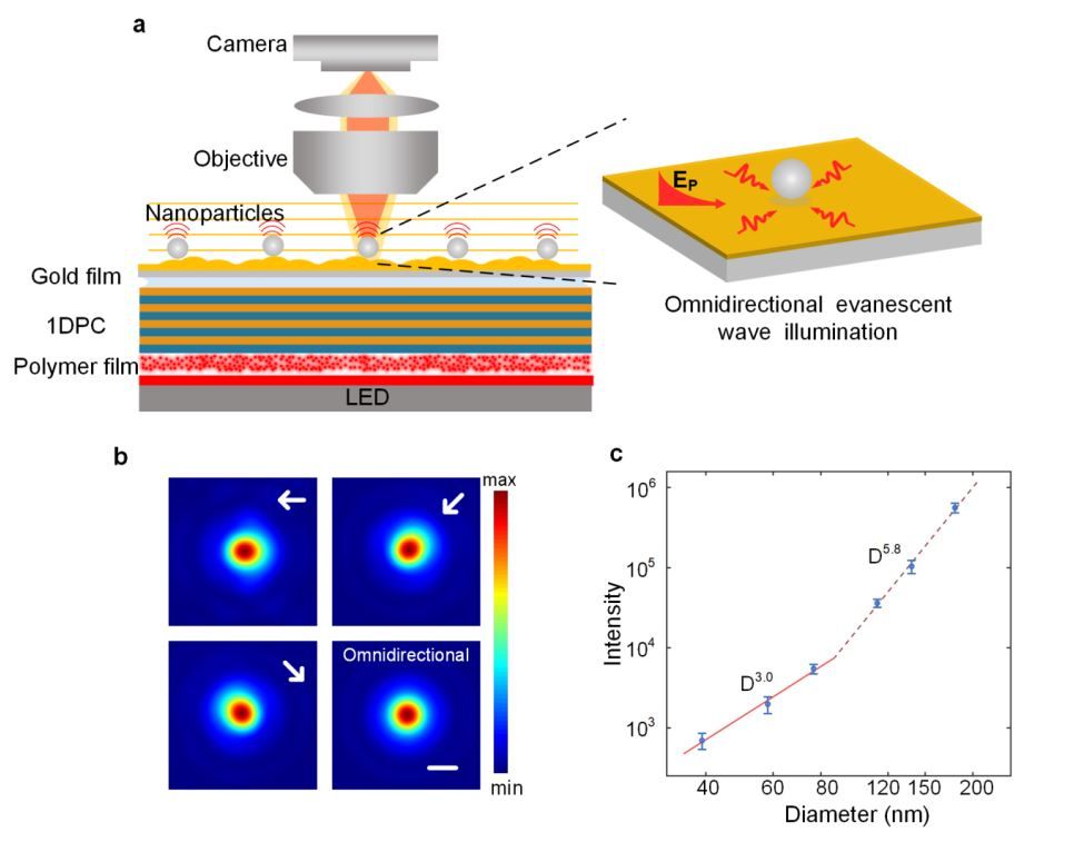 论文中,张斗国教授课题组与浙江大学刘旭教授、上海理工大学詹其文教授合作,将一维光子晶体、贵金属薄膜、纳米颗粒掺杂聚合物薄膜等微纳结构组成的光子器件集成到常规LED照明光源上,实现了全方向表面等离子体波的激发。该光子器件的架构与设计原理如图1a所示。研究人员利用数值仿真与单颗粒成像实验验证了全方向表面等离子体波照明成像系统具有更加对称的点扩散函数(图1b)。进一步,在实验上通过对不同粒径颗粒的散射光强度进行统计,验证了该全方向表面等离激元照明器件在纳米颗粒并行探测方面具有更高的灵敏度,如图所示1c所示。另外,得益于一维光子晶体和贵金属薄膜的平面化特性,该照明器件可以实现厘米级别的宽视场全方向表面等离子体波照明,其成像视场面积远大于基于油浸物镜的表面等离子体散射光学显微镜,且成像系统架构简洁与稳定。