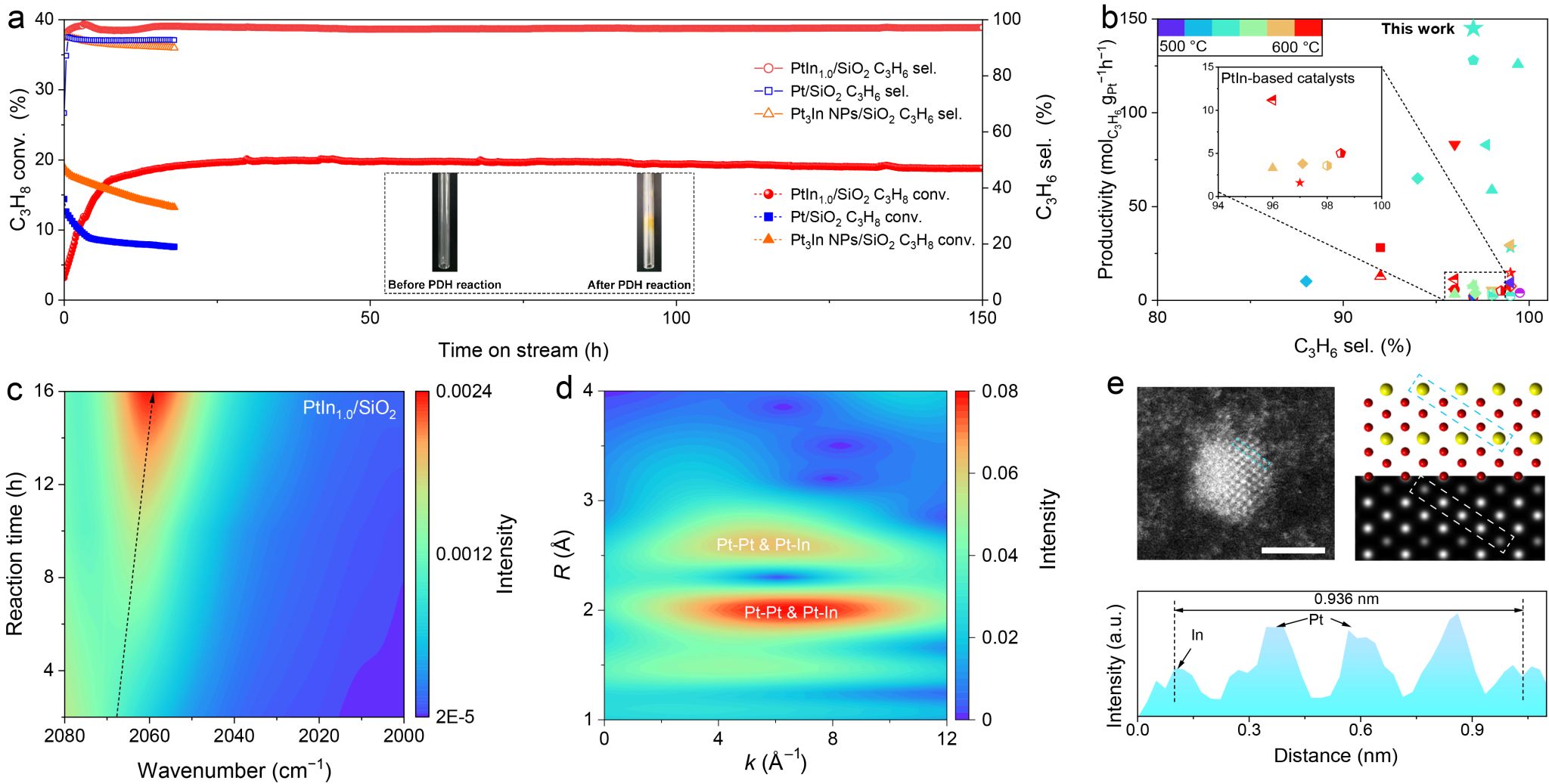 研究人员通过表征反应后催化剂的结构发现,在高浓度的丙烯产物诱导下,大量铟物种从催化剂中挥发并凝固在石英管末端,这导致了活性位点铂的暴露以及诱导期的出现。铂铟合金团簇逐渐演变为平均尺寸仅为1.3纳米的铂铟金属间化合物,超小的尺寸来源于界面处氧化铟物种带来的抗烧结性能。上述研究强调了催化剂动态结构演变中催化产物扮演着不可忽视的重要角色,为高性能丙烷脱氢催化剂的理性设计提供了新的视角(图2)。