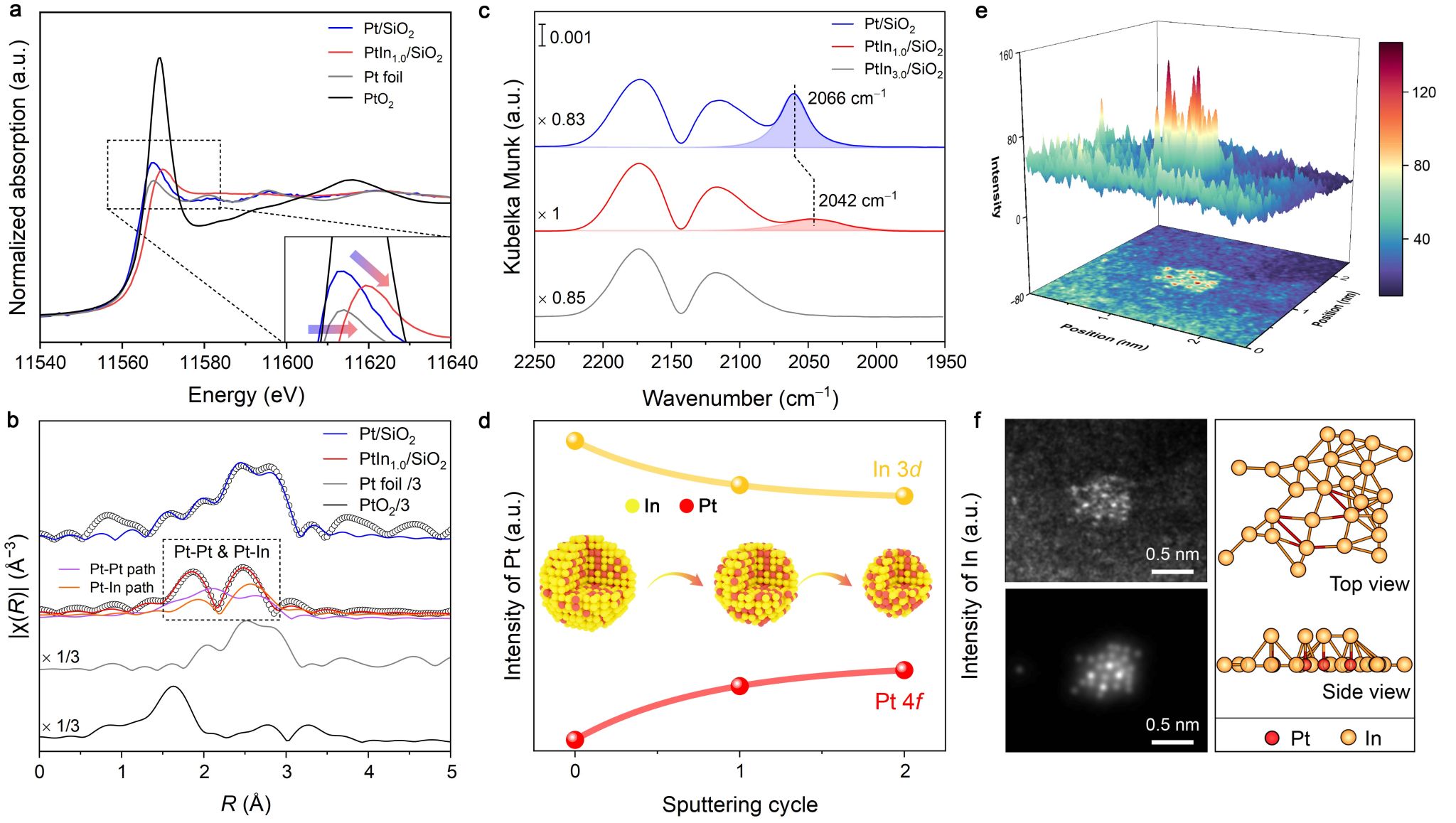 研究人员利用溶液相的分步强静电吸附法在二氧化硅表面依次负载铟和铂,并经过高温氢气还原获得合金团簇。一系列谱学实验结果表明,仅有少量铟被还原并与铂合金化。在所形成的铂铟合金团簇中,铟更倾向于分布在表面。同时,存在于铂铟合金与二氧化硅载体之间的氧化铟物种被证明能够有效抑制铂铟合金的烧结(图1)。